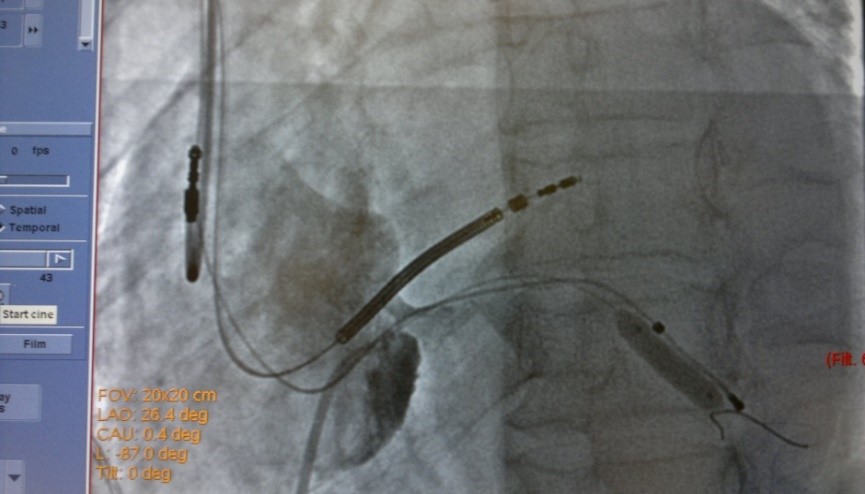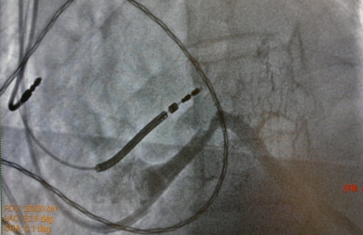 19.08.2015 выполнена попытка имплантации СРТ-D устройства, имплантировать ЛЖ электрод в заднею вену сердца не представилось возможным ввиду многократных смещений ЛЖ электрода в КС. Через 7 дней, вторым этапом, аритмологами и ренгенхирургами принято решение о имплантации ЛЖ электрода в заднюю вену ЛЖ с фиксирующим стентированием ЛЖ электрода в задней вене ЛЖ. Под м/а выполнен разрез в левой подключичной области по п/о рубцу. Выделен и выведен в рану ИКД. Пунктирована подключичная вена из раны. Желудочковый дефибриллирующий электрод активной фиксации позиционирован и вкручен в область МЖП 15 мV (с целью достаточного межэлектродного расстояния) [3], порог стимуляции желудочков 0,8 мА. В ПП по системе доставки доставлен катетер для КС, установлен в КС. Выполнена ангиография коронарного синуса (рис.1) – доступна единственная задняя вена ЛЖ, размером более 4 мм. ЛЖ электрод заведен через систему доставки и установлен в заднюю вену ЛЖ по коронарному проводнику. Порог стимуляции ЛЖ-2.0 мА, порог чувствительности 16.6 мВ. Стимуляции диафрагмального нерва нет. При попытке удаления системы доставки, последний дислоцируется в КС. Множественные попытки имплантации ЛЖ электрода безуспешны в связи с дислокацией последнего. При имплантации в дистальное русло порог ЭКС >6мА. ЛЖ электрод установлен в дистальное русло ЗВЛЖ по коронарному проводнику. Принято решение о фиксирующем стентирование ЛЖ электрода в ЗВЛЖ. Под м/а пунктирована v.f.s., установлен интродьюсер 6 Fr. К устью КС подведен проводниковый катетер JR4 6FR. В дистальное русло ЗВЛЖ проведен коронарный проводник (рис.2). По проводнику в ЗВЛЖ заведен стент 4.5-16 mm, выполнена имплантация (рис.3). При контрольной ангиографии диссекций не выявлено, стент расправлен полностью. Под контролем Rg-скопии и на раздутом баллоне удалена система доставки ЛЖ электрода, ЛЖ электрод стабилен (рис.4), порог ЭКС-0.8 мА (до стентирования 1,5 мА), сенсинг 10 мВ. Электроды фиксированы в ране. Подключен CRT-D и помещен в прежнее ложе над грудными мышцами. На ЭКГ эффективная бивентрикулярная стимуляция.