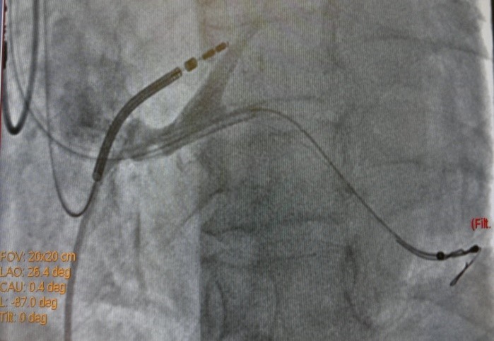 Рис.2. Рентгеновский стоп-кадр при контрастирование коронарного синуса и проведение коронарного проводника в «целевую» вену.