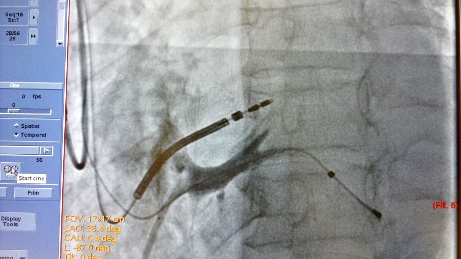 Рис.3. Рентгеновский стоп-кадр при имплантации стента в заднюю вену ЛЖ для фиксации левожелудочкового электрода. Наиболее оптимальное расположение ЛЖ электрода.