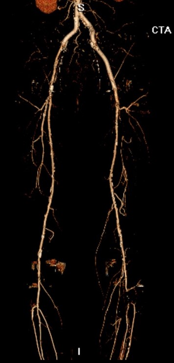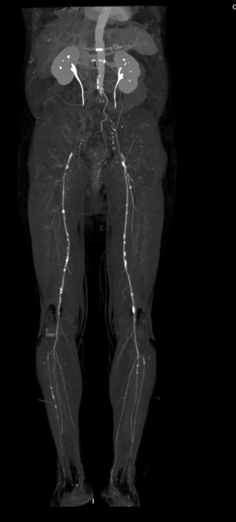•МСКТ аорты и артерий н/конечностей: КТ признаки окклюзии терминального отдела аорты и подвздошных артерий с обеих сторон.