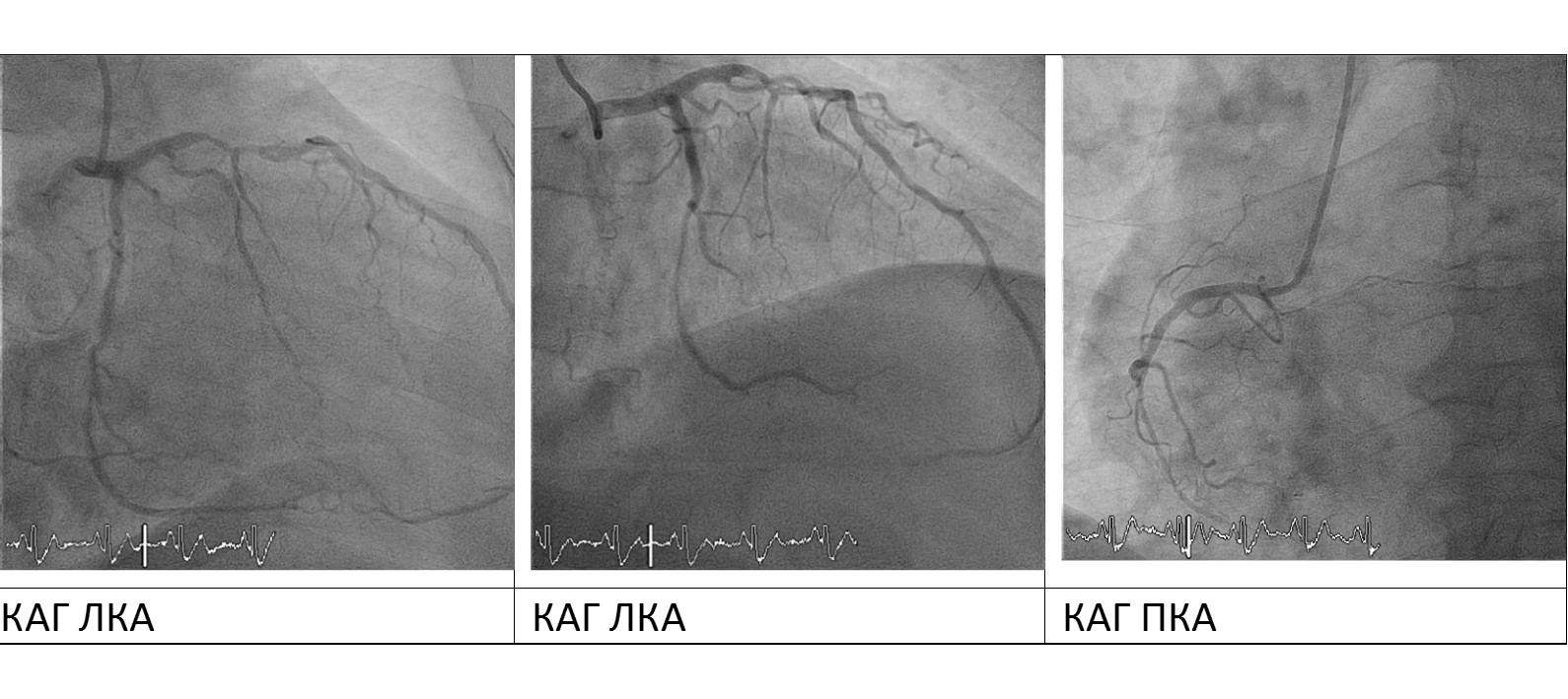 ЛКА – ствол: без значимых стенозов, ПМЖВ: неровность контуров, критический стеноз среднего сегмента до 90%, ОВ: неровность контуров, стенты в среднем и дистальном сегментах без признаков тромбоза и рестеноза. ПКА: неровность контуров, хроническая окклюзия дистального сегмента.