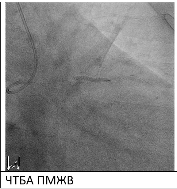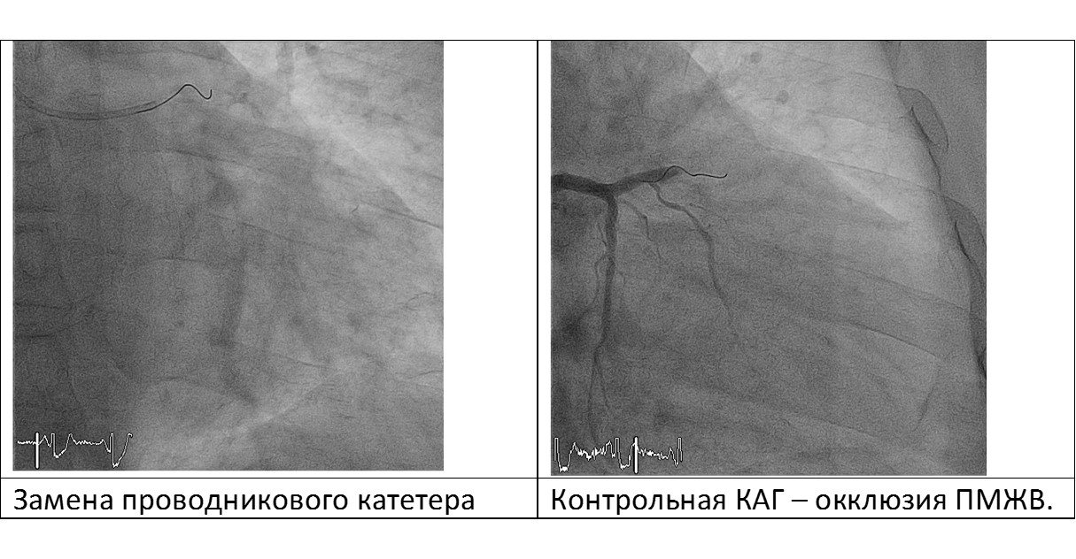 В правую бедренную артерию установлен интродьюсер 6F, проводниковый катетер CLS 4 установлен в устье ЛКА, обеспечив жесткую поддержку инструментам. При контрольной коронарографии – окклюзия ПМЖВ.