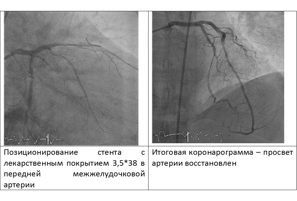 С помощью микрокатетера «найден» истинный просвет ПМЖВ, выполнена баллонная ангиопластика и стентирование передней межжелудочковой артерии DES 3.5*38mm.