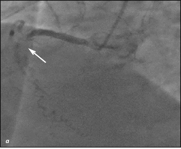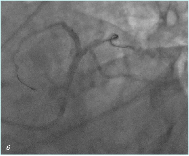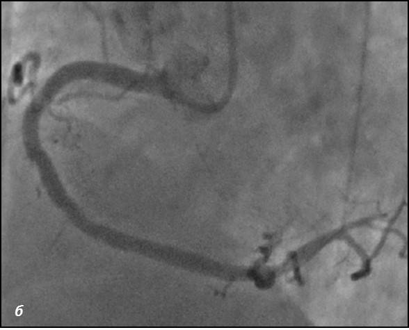 Рис.2 Ангиограмма левой коронарной артерии. а) при коронарографии левой коронарной артерии –артерия окклюзирована от устья (стрелка); б) проходимость по левой коронарной артерии полностью восстановлена