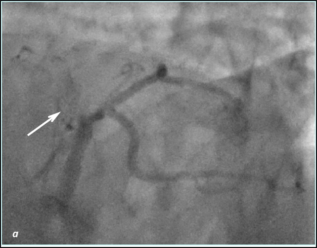 Рис.1 Ангиограмма правой корнарной артерии. а) при коронарографии правой коронарной артерии –артерия окклюзирована от уровня п/3 (стрелка); б) проходимость по правой коронарной артерии полностью восстановлена; в) после выполненной реканализации и стентирования ПКА отмечаются межсистемные перетоки в ПМЖВ-ЛКА (стрелка)