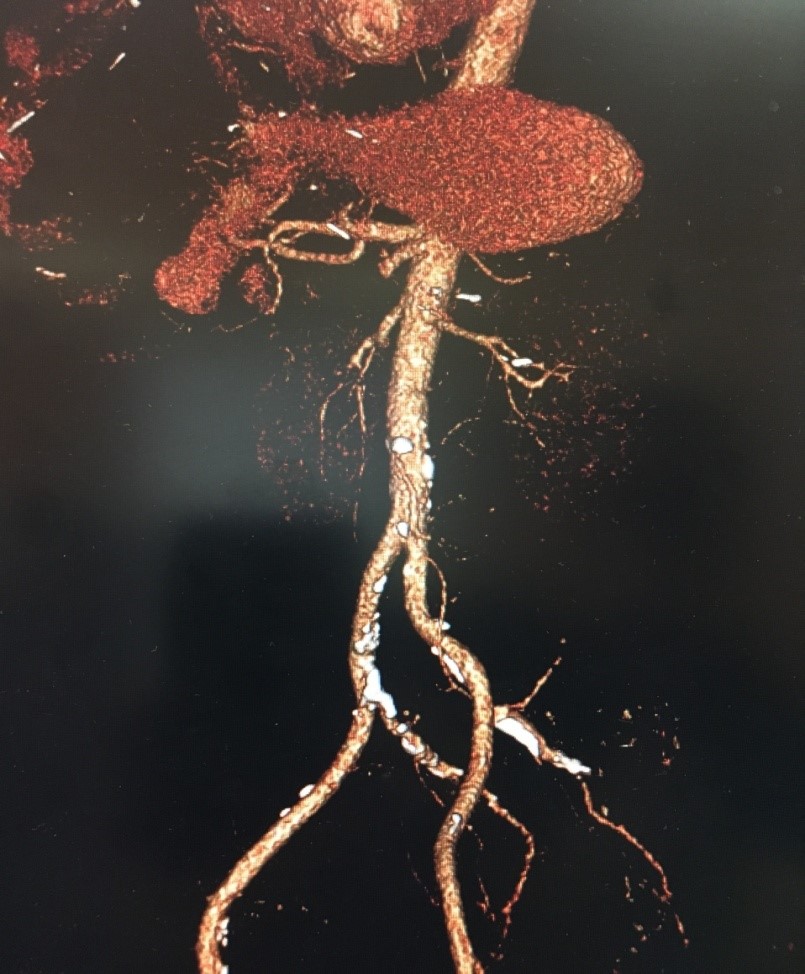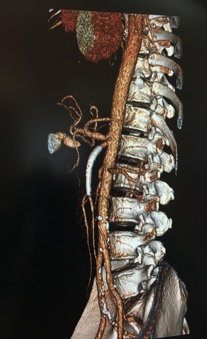 Рисунок 1. МСКТ ангиография брюшной аорты. Стрелкой указана тромбированная ВБА.