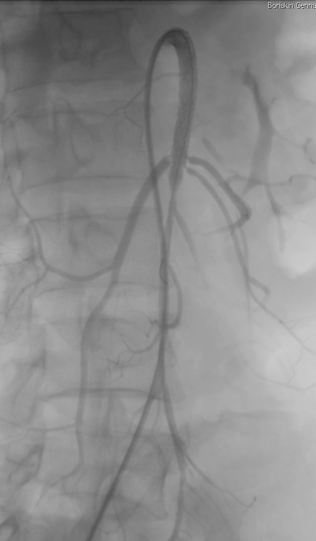12.01.2017г в экстренном порядке пациент прооперирован: Правым трансфеморальным доступом выполнена ангиография висцеральных ветвей брюшного отдела аорты, на которой выявлена тромботическая окклюзия верхней брыжеечной артерии (ВБА) (рис. 2). Через установленный в ВБА проводниковый катетер JR7F в несколько этапов выполнена аспирационная тромбэктомия, с извлечением тромботических масс, (рис. 3). На контрольной ангиографии признаки субокклюзирующей диссекции и тромбоза в проксимальной трети ВБА (рис. 4). Выполнена имплантация стента Assurant Cobalt 7,0X60 мм, в пораженный участок ВБА (рис. 5). На контрольной ангиографии получен удовлетворительный непосредственный ангиографический результат, признаков тромбоза и диссекции нет (рис 6). Медикаментозная поддержка чрезкожного вмешательства проводилась по стандартной схеме лечения больных острым коронарным синдромом клопидогрель 600 мг и аспирин 300 мг внутрь однократно, 100 ед./кг гепарина интраартериально. Анестезиологическое обеспечение ограничилось нейролептаналгезией. Время эндоваскулярной интревенции составило 32 минуты. Время рентгеноскопии 14 минут. В течение суток больной находился под наблюдением в РАО. В раннем послеоперационном периоде отмечается купирование болевого синдрома. Спустя 24 часа после восстановления кровотока в верхней брыжеечной артерии выполнена диагностическая лапароскопия, при котором признаков некроза кишечника не выявлено.