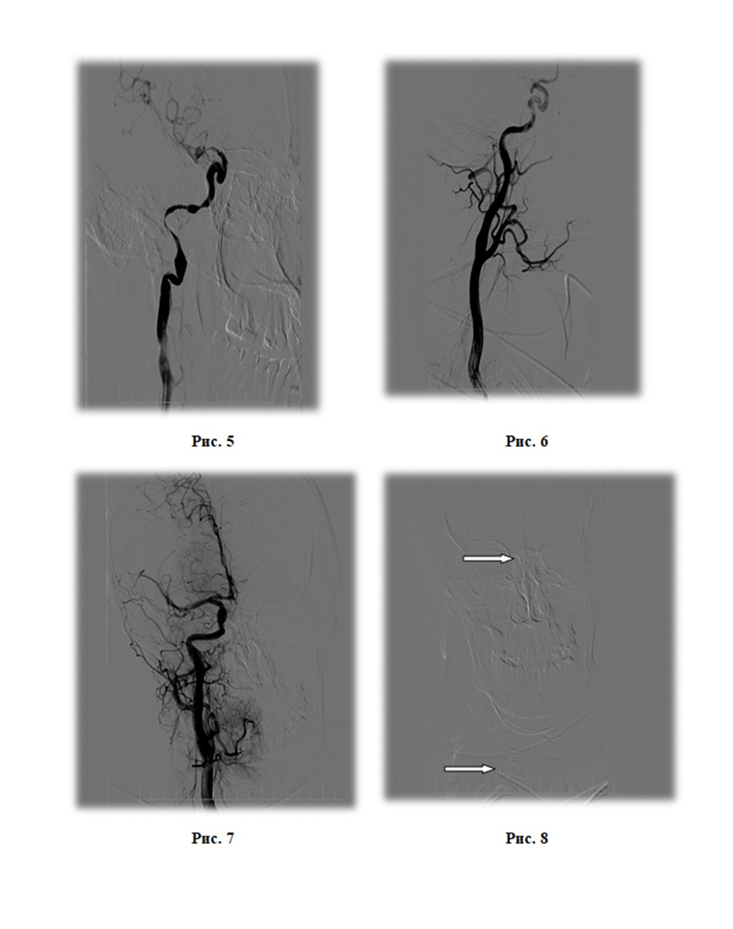 Достоверно не уточненное время начала заболевания (так называемый «инсульт во сне») препятствовало проведению системной тромболитической терапии для растворения тромба во внутренней сонной артерии (ВСА). В связи с выявлением зоны нарушенного кровоснабжения в правом полушарии головного мозга только в одном из режимов МРТ (нет изменений на FLAIR) расчетная экспозиция заболевания не превышала 6 часов. Для оценки возможности внутрисосудистого вмешательства по восстановлению кровотока в заинтересованном сосуде пациентка срочно переведена в ангиорентгенхирургическую операционную.