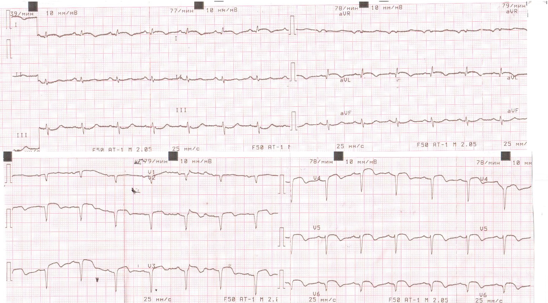 Пациент переведен в ПИТ отделения неотложной кардиологии. ЭКГ после операции.