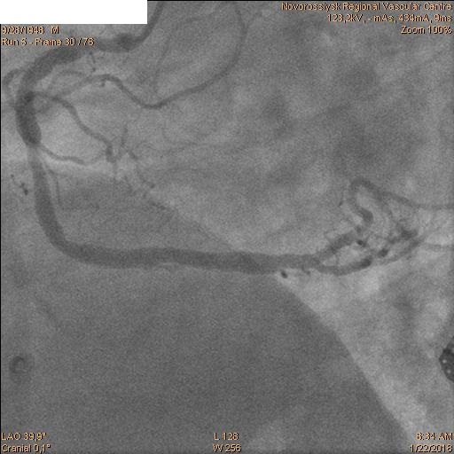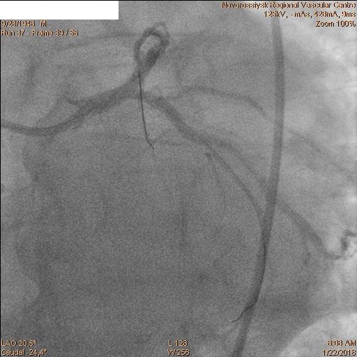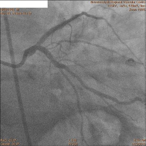 В 06.00 пациент в экстренном порядке подан в рентгеноперационную. Пациенту выполнена коронарография, по данным которой выявлены стеноз ствола ЛКА 60% с переходом на устья ПНА и ОА, окклюзия ПНА от устья и стеноз устья ОА 60%.