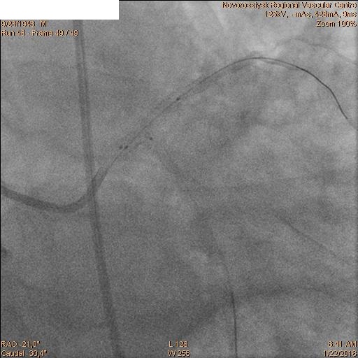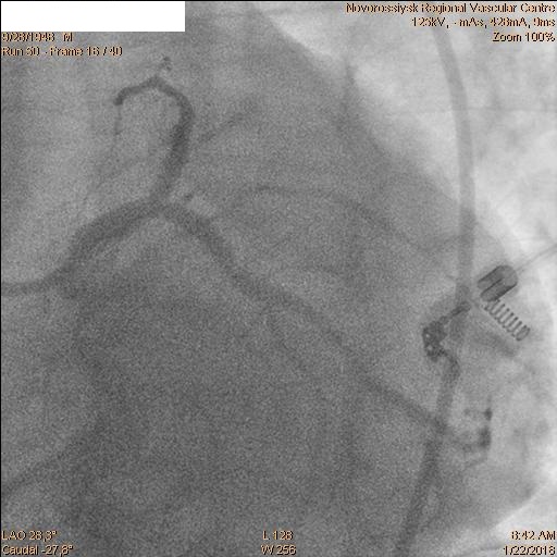 Последовательно заведены коронарные проводники в дистальные сегменты ПНА и ОА. Первым этапом была выполнена реканализация, баллонная ангиопластика ПНА баллоном 2.5х20 мм и стентирование ствола ЛКА с переходом на проксимальный сегмент ПНА стентом 4.0х28 мм.
