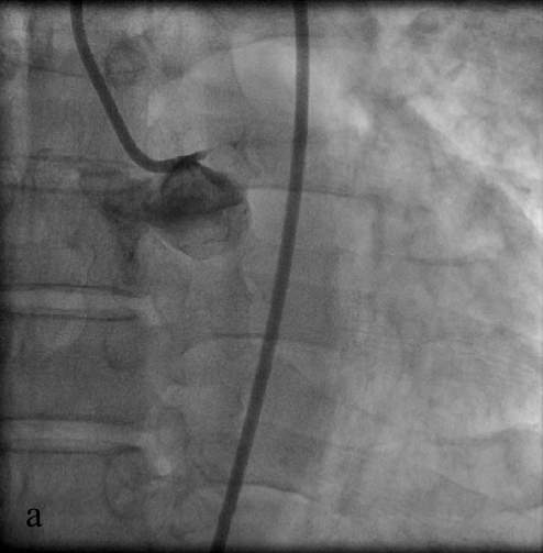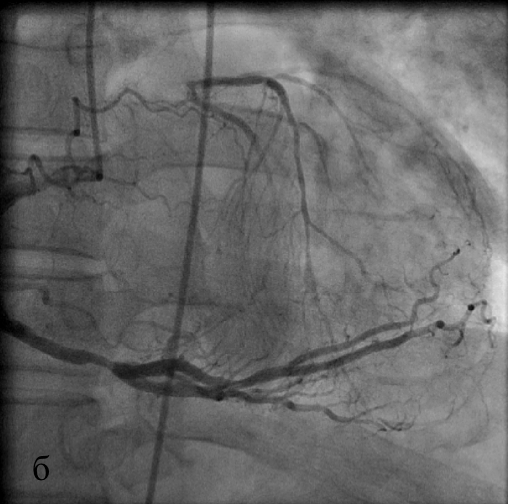 На исходных коронарограммах выявляются тотальная окклюзия ствола ЛКА (а), система ЛКА заполняется по межсистемным коллатералям из бассейна ПКА (б).