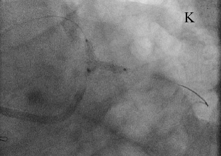 В устье ОВ с переходом на ее проксимальный сегмент был имплантирован стент XienceV (и), после чего выполнена постдилатация по методике «целующихся» баллонов (к). При контрольной КГ стентированные сегменты проходимы, достигнут хороший ангиографический результат (л).