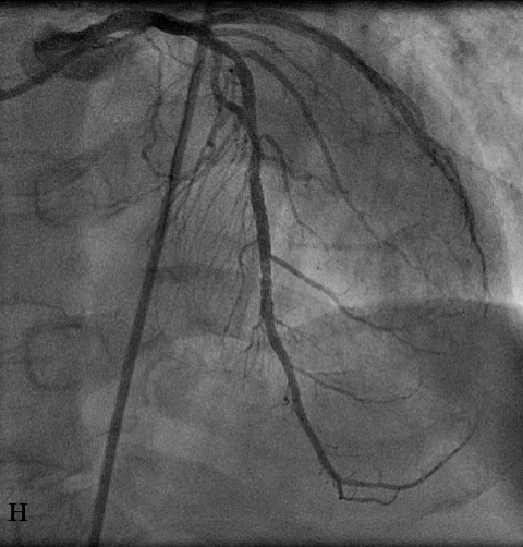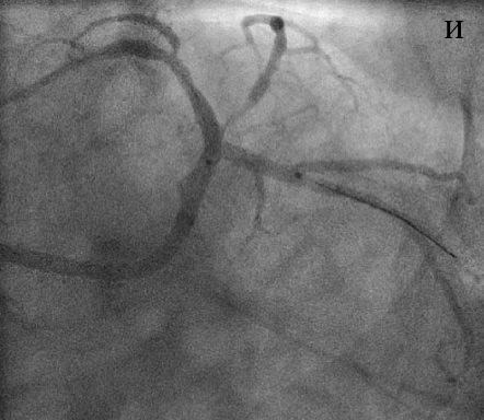 В связи с наличием выраженного пролонгированного стеноза на границе среднего и дистального сегментов ПМЖВ (м) в область сужения был имплантирован стент Cypher с хорошим ангиографическим результатом (н).