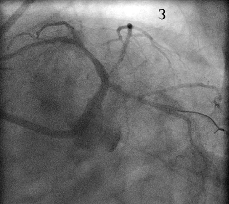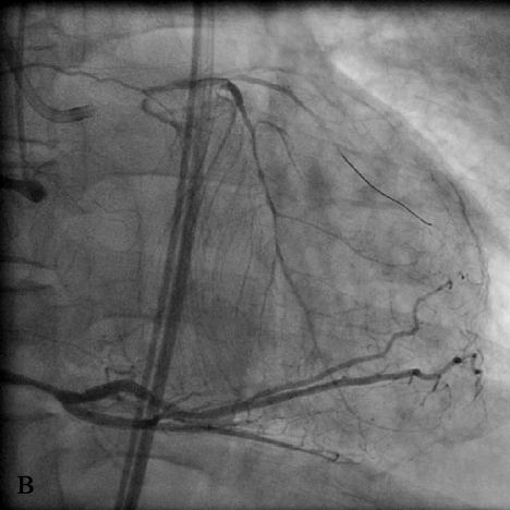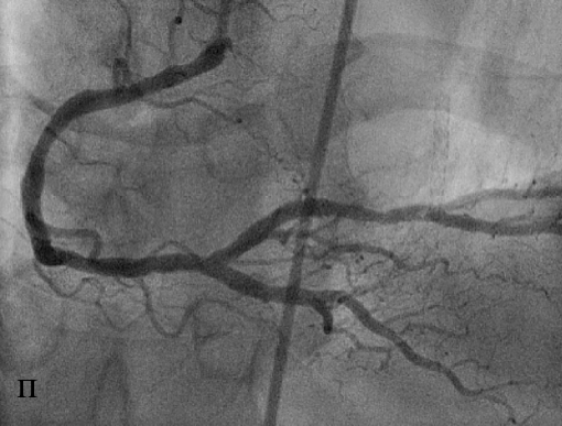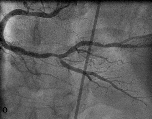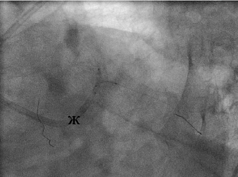 При коронарографии ПКА выявлен выраженный стеноз дистального сегмента ПКА с переходом на устье ЗМЖВ (о). В дистальную треть ПКА с переходом на устье ЗМЖВ был имплантирован стент XienceV, сужение устранено, достигнут хороший ангиографический результат (п).