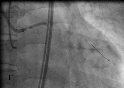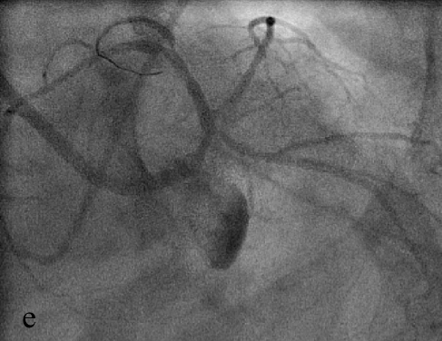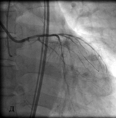 Коронарный проводник проведен за зону окклюзии, что подтверждено при выполнении коронарографии из ПКА (в), после чего выполнена баллонная ангиопластика окклюзированного ствола ЛКА (г). При контрольной коронарографии система ЛКА заполняется антеградно (д).